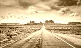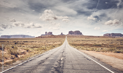 Retro stylized picture of Monument Valley seen from famous U.S. Route 163, Utah, USA.