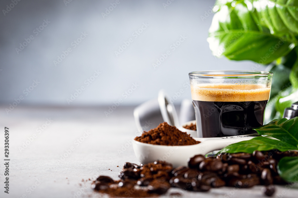 Background with glass cup of coffee, coffee beans and leafs. Beverage cafe shop concept with copy space.
