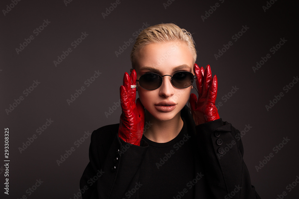 Portrait of a stylish blonde with red leather gloves on a gray isolated background. Earrings in the form of large rings. Aggressive style girls.