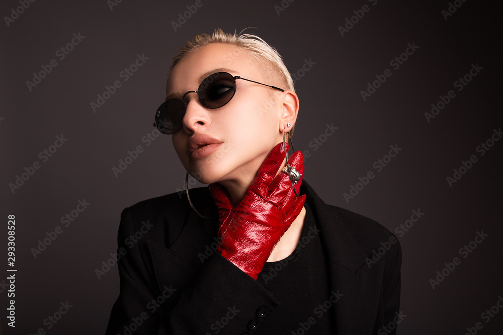 Portrait of a stylish blonde with red leather gloves on a gray isolated background. Earrings in the form of large rings. Aggressive style girls.
