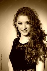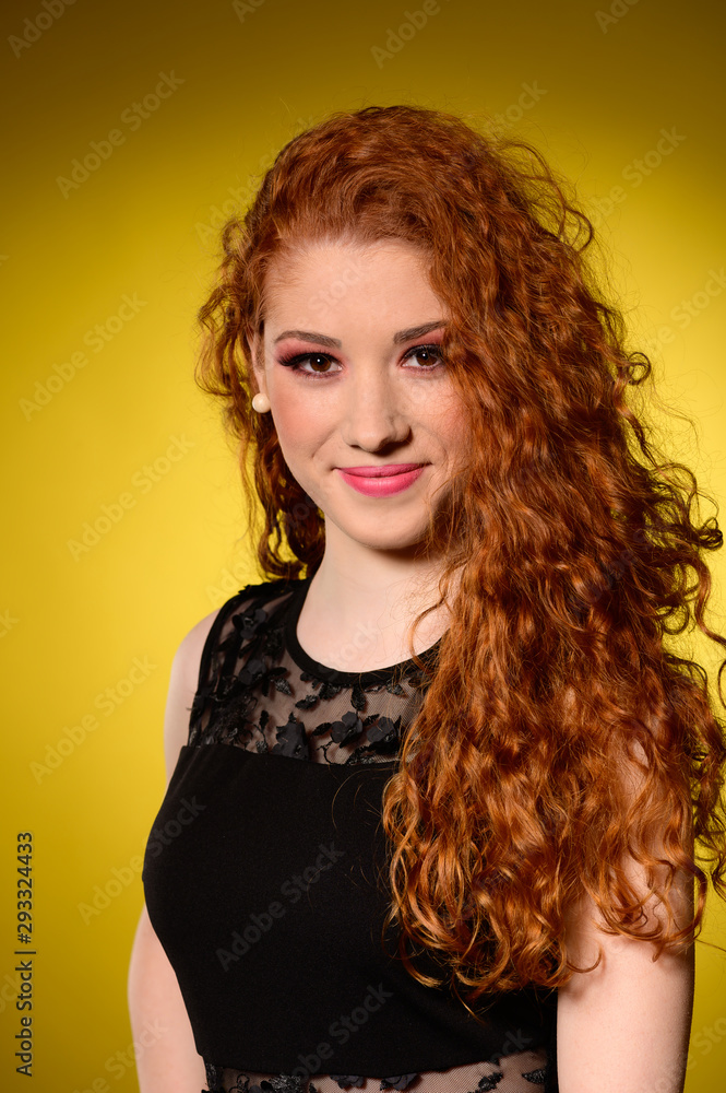 Beauty portrait of a preety redhead in black elegant dress over warm yellow background