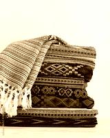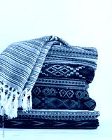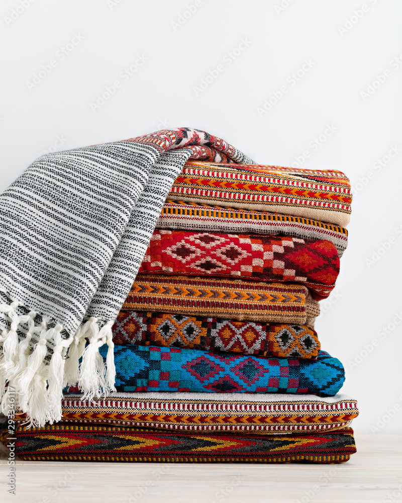 Warm rugs, stoles are stacked in stack of several rows. Accessories for cold weather from natural material. Copy space.