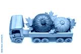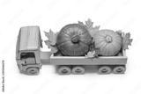 A wooden toy truck carries pumpkins and autumn maple leaves in back. White background, copy space.