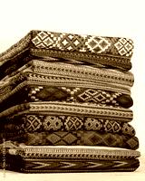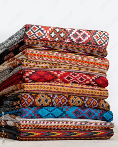 Woolen blankets, stoles folded and stacked in stack of several rows. Beautiful texture and colors of products create amazing effects. Studio shot.