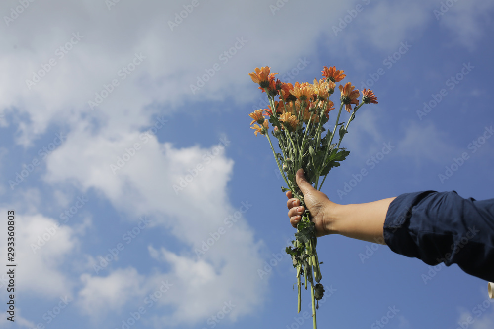 Bunch of flowers in hand against the bright and blue sky background. Copy space for text or design.