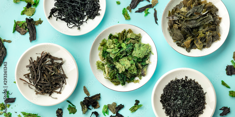 A panorama of various dry seaweed, sea vegetables, shot from the top on a teal blue background