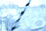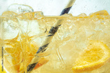 Close up of lemon slices in stirring the lemonade and ice cubes on background. Texture of cooling sweet summer's drink with macro bubbles on the glass wall. Fizzing or floating up to top of surface.