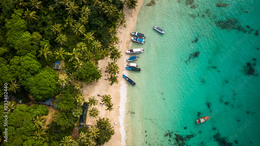 topdown view of a beautiful beach with boats and palm trees in Phu Quoc, Vietnam