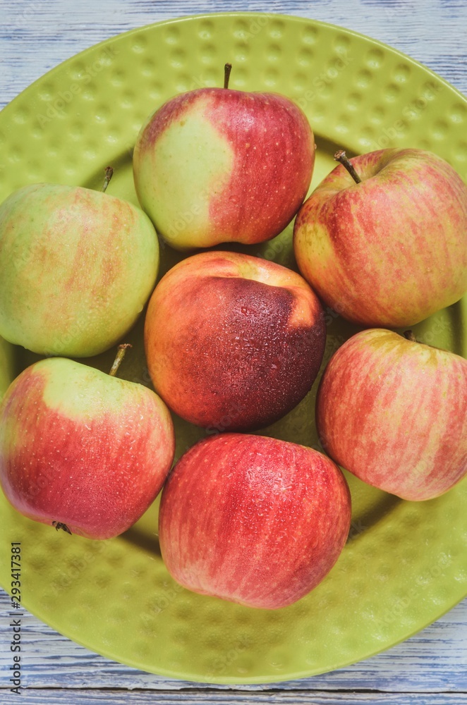 Fresh red fruits. Apples on a green plate on a wooden background.