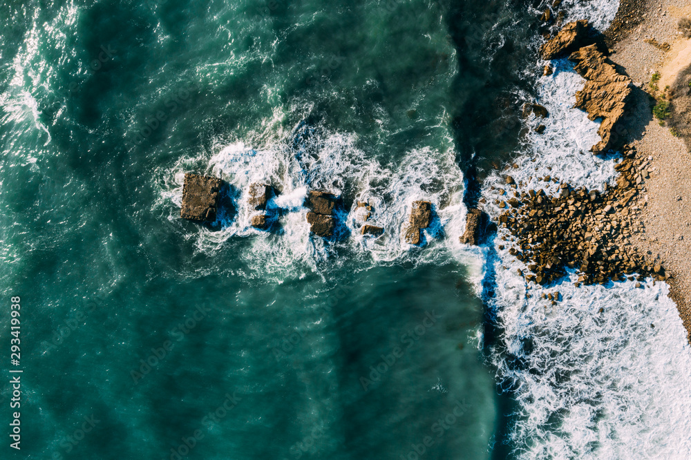 Aerial view of concrete sea fortification texture. Breakwaters. Sea city beach with breakwaters.