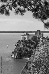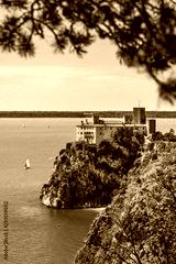 Gulf of Trieste. High cliffs Between boats, karst rocks and ancient castles. Duino. Italy
