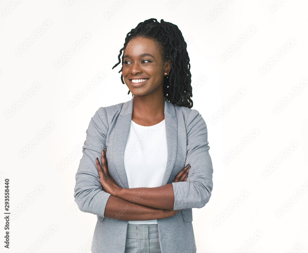 Positive Black Business Lady Posing Crossing Hands Over White Background