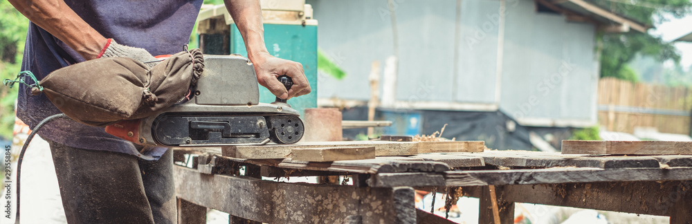 Carpenter sanding wood with belt sander at workshop in wooden cutting board project or woodworking carpentry