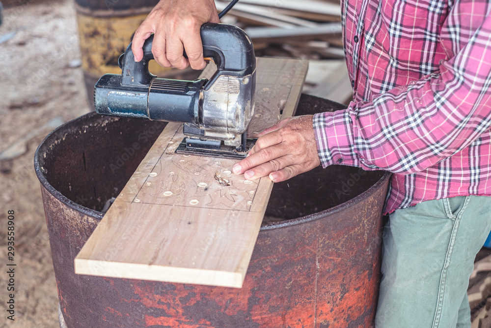 Carpenter using a jisaw to cutting wood for furniture carvin door.