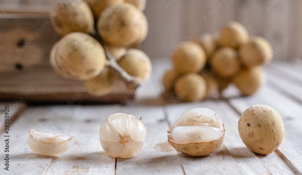 Mix of peeled and clusters whole of exotic Thai fruit called Longkong or lansium parasiticumor southern langsat on wooden table and background. It is a famous sweet tropical fruit in southeast asia.