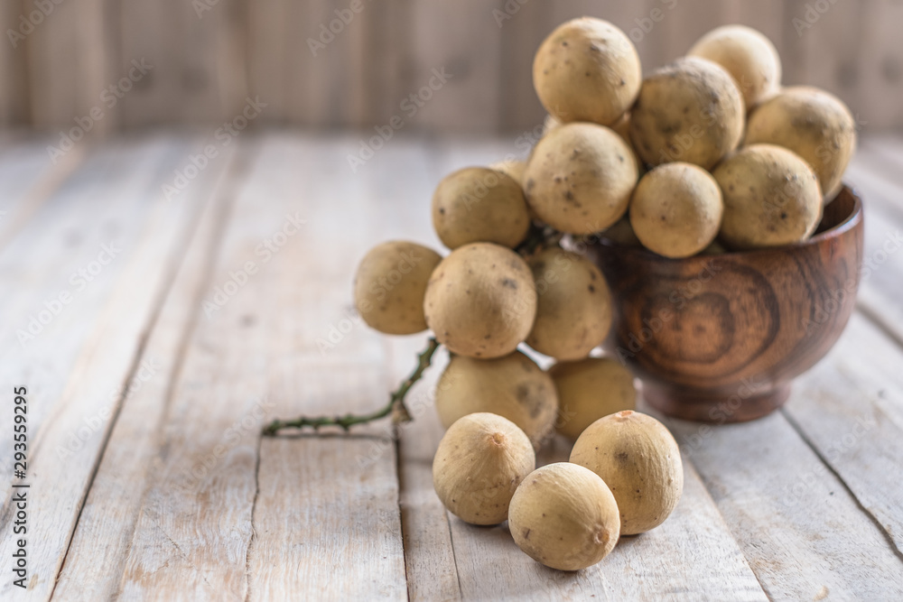 Clusters of exotic Thai fruit called Longkong or lansium parasiticumor southern langsat on wooden table and background. It is a famous sweet tropical fruit in southeast asia.