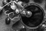 Fresh grapes and glass of red wine, top view