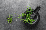 Fresh rosemary plant. Background with rosemary herbs in mortar, top view.