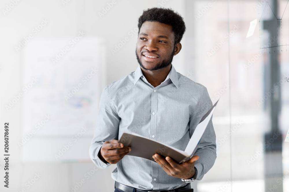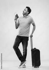 family, tourism and vacation concept - happy indian man in polo shirt with travel bag, passport and air ticket looking up over grey background