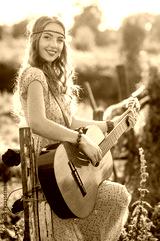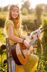 woman wearing a bohemian style, playing a guitar on field at warm light of sunset