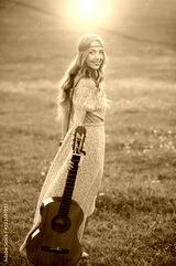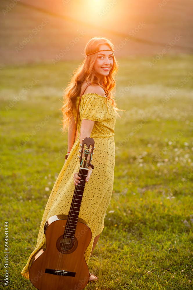 Beautiful hippie girl with guitar dancing on field at sunset