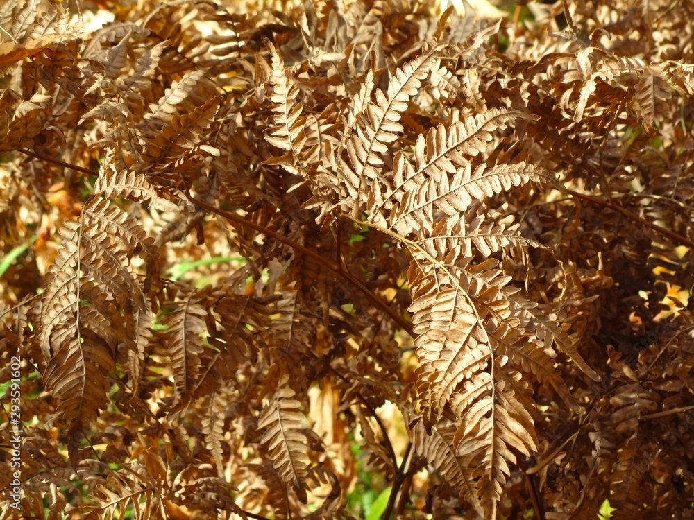 Beautiful fern leaf in the fall. Sunlight on the dry leaves of a fern. Autumn golden branch of dried fern. Close-up. September in the Siberian forest. Russia.