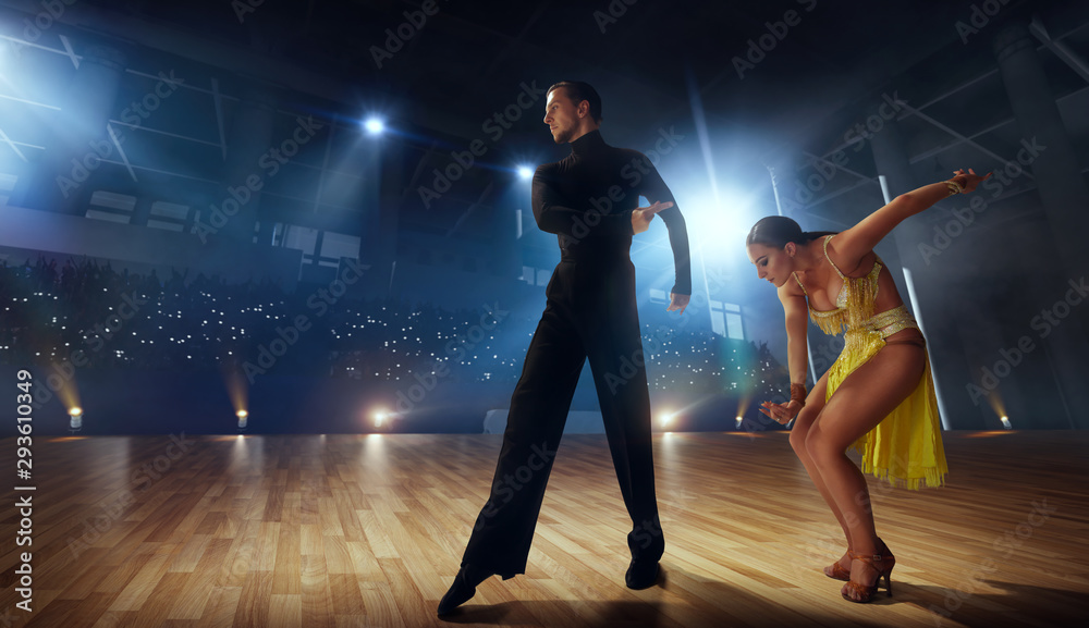 Couple dancers perform latin dance on large professional stage. Ballroom dancing.