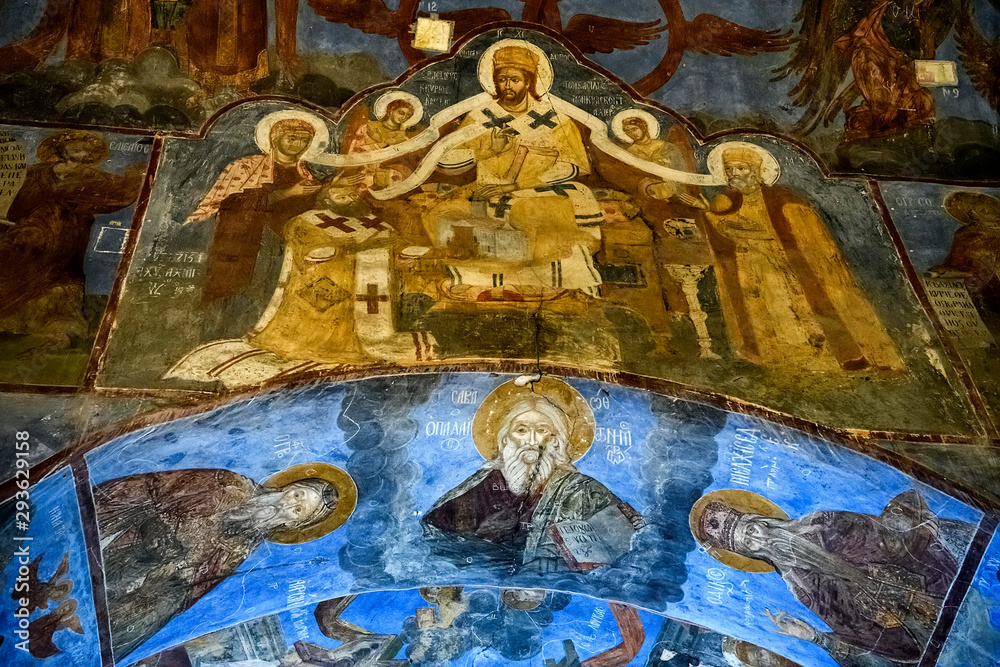 Fragments of frescoes wall paintings on the walls of the Church of the Saviour at Berestove in Kyiv, Ukraine.