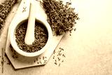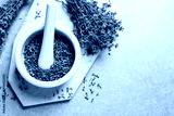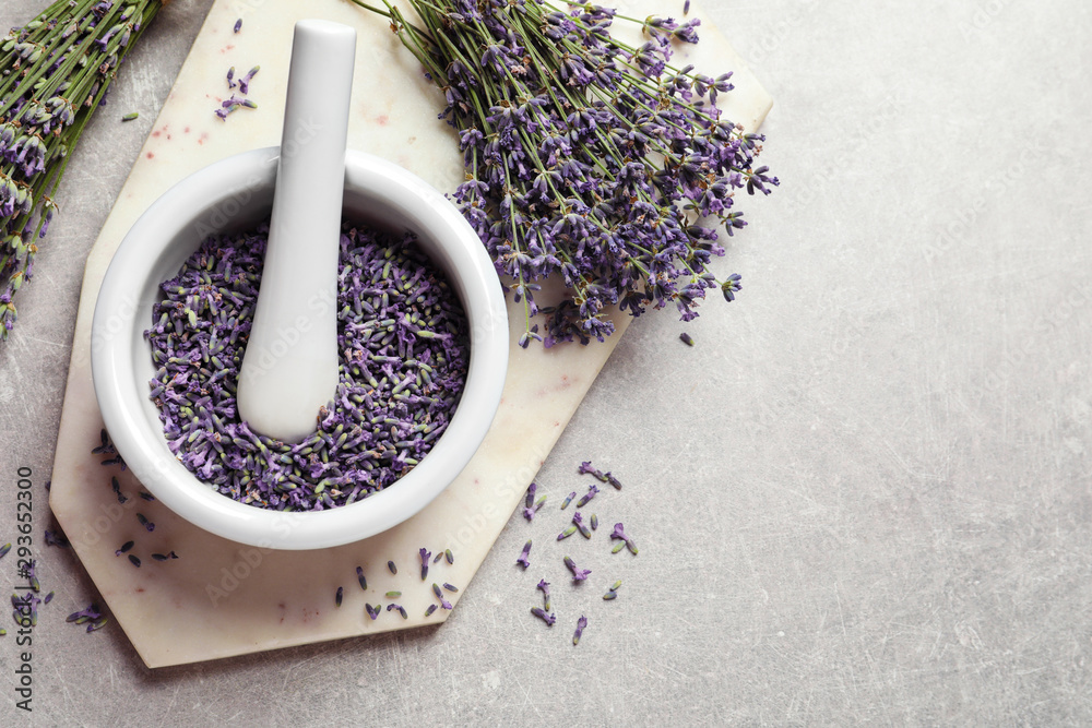 Top view of mortar and pestle with lavender flowers on grey stone background, space for text. Natural cosmetic