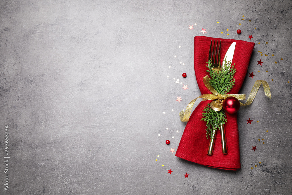 Cutlery set on grey table, top view with space for text. Christmas celebration