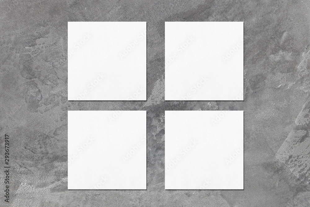 Four empty white square business card mockups with soft shadows on elegant dark grey concrete background. Flat lay, top view