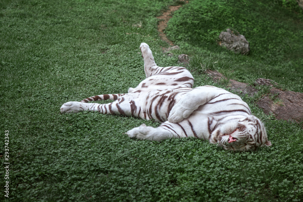white tiger sleeps on green grass upside down, predator on vacation, zoo
