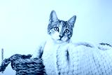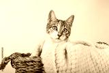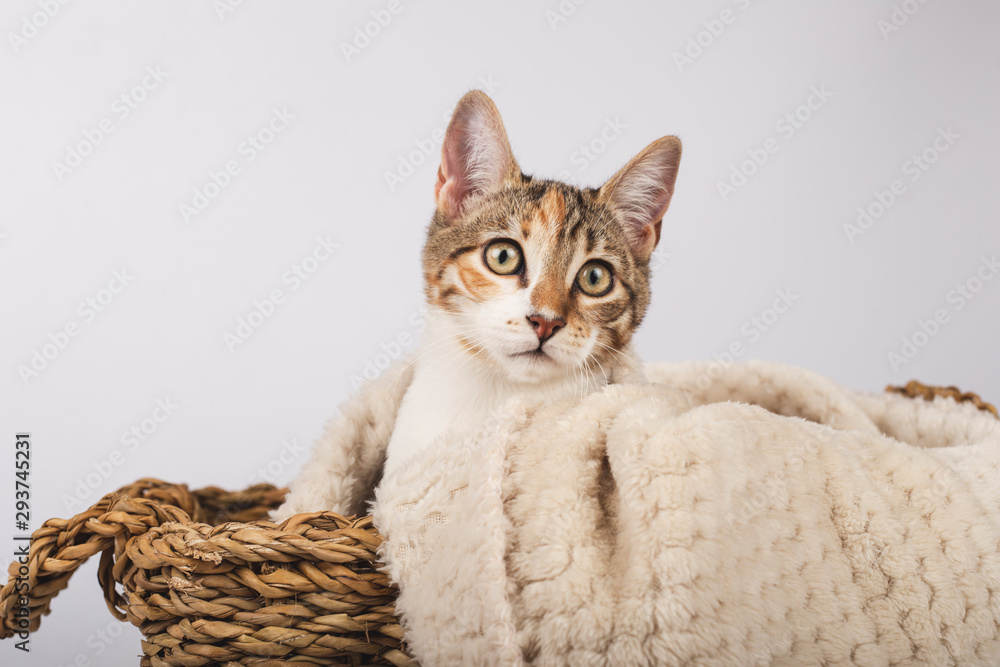 Cute tricolor puppy kitten tucked in a wicker basket with a blanket on white background.