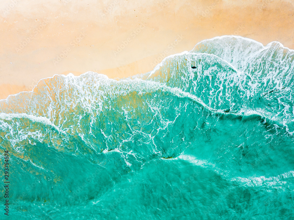 Top view of green turquoise sea water. Capture sea wave and beach in summer.