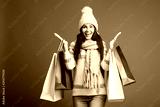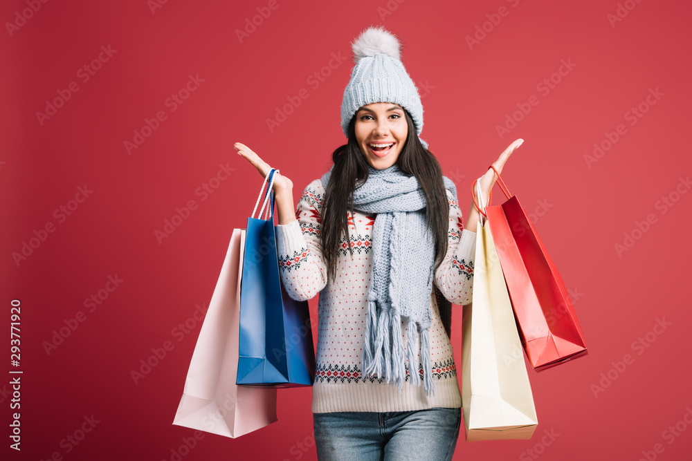 excited woman in winter sweater, scarf and hat holding shopping bags, isolated on red