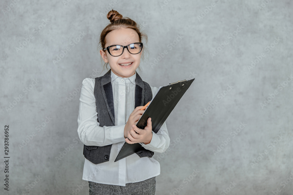 The little lady boss is on a gray background. During this, holds a black folder and a yellow pencil looking into the camera.