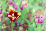 red rose against the backdrop of a blooming garden