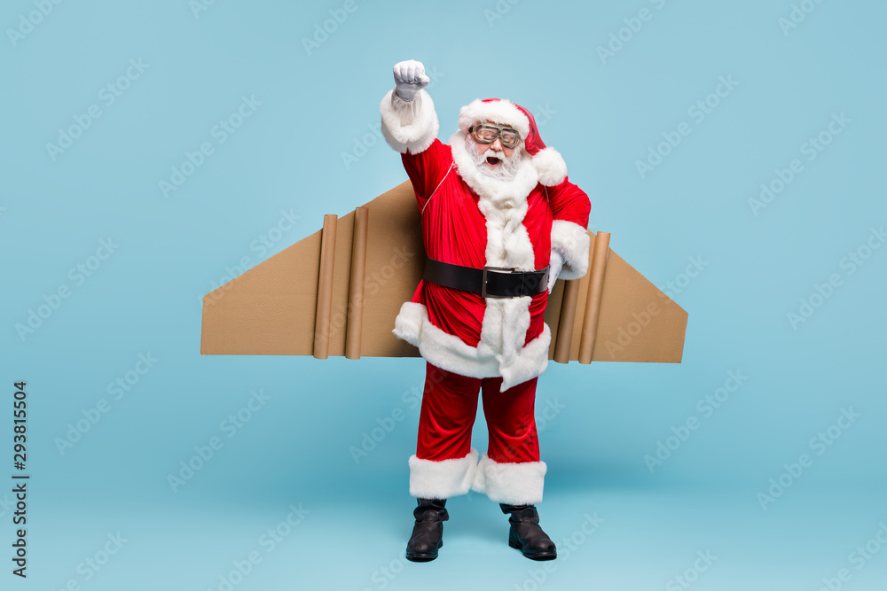 Full length body size view of his he nice fat cool glad cheerful cheery excited bearded Santa wearing plane wings fast shipping shop delivery service isolated over blue pastel color background