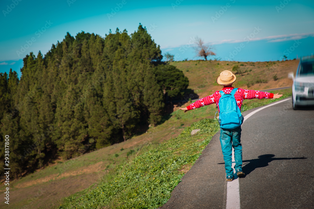 young boy travel on the road with car in nature