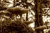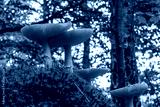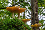 Four beautiful red fly agaric on a tree trunk with moss, Wassenaar, Netherlands