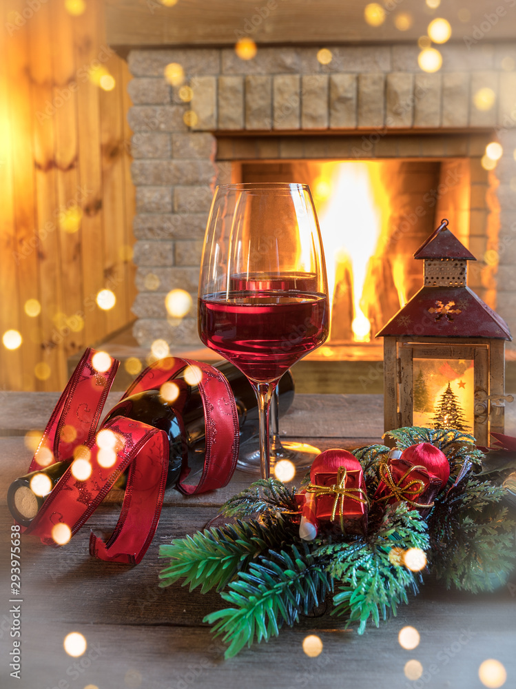 Cozy scene before fireplace with glasses of wine, and christmas decorations, in country house, winter vacation.