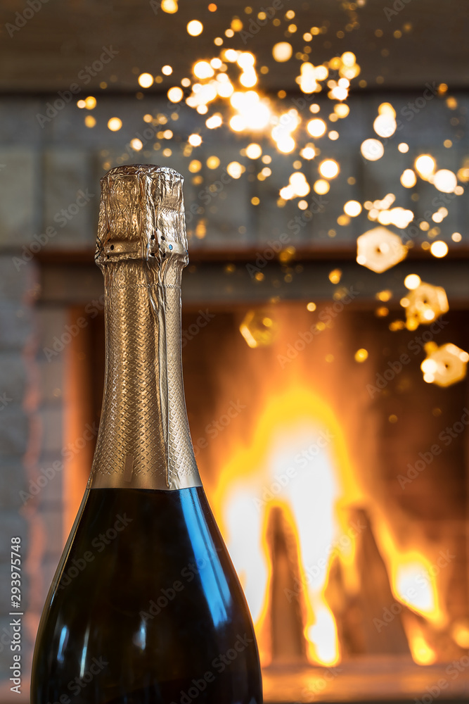 Cozy scene before fireplace with a bottle of champagne wine, in country house, winter vacation.