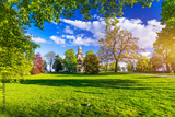 Spring view in Letna Park, Prague, Czech Republic. Spring in Prague (Praha), beautiful Letna park (Letenske sady) in sunlight, sunny landscape, popular tourist destination, Prague, Czech Republic