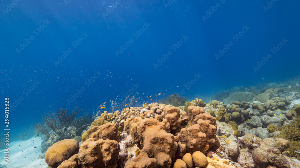 Seascape of coral reef in the Caribbean Sea around Curacao with coral and sponge
