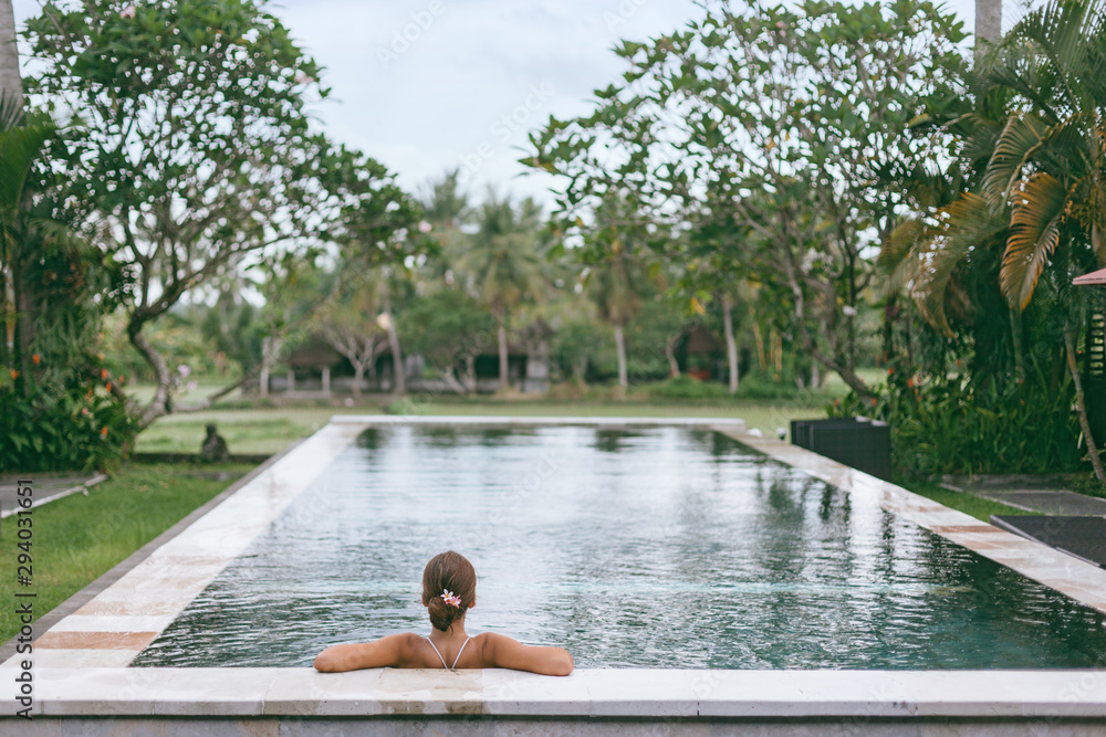 Infinity pool with a view on palm trees, Ubud, Bali