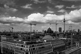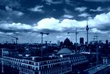 Panorama of Berlin center with many construction cranes, Germany. May 2014