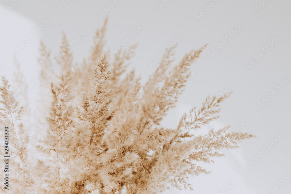 Beige reeds agains white wall. Beautiful background with neutral colors. Minimal, stylish, trend concept. Parisian vibes.