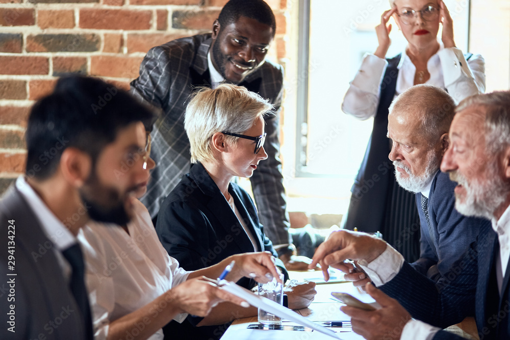 Group of businessmen wear suits sit at table in office and discuss new project, smile. caucasian blond woman and african man stand, behind open window. Camera focused on man and woman speak