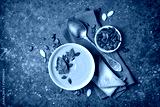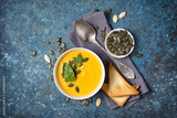 Bowl of vegetarian pumpkin soup with seeds and vintage spoon