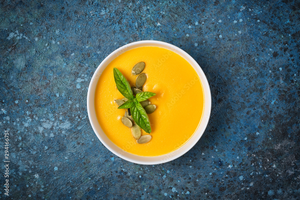 Bowl of vegetarian pumpkin soup with seeds and basil